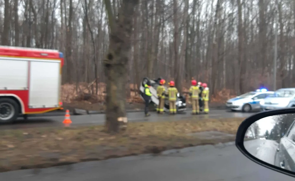 AKTUALIZACJA: Według ustaleń policji kierowca nie dostosował prędkości do warunków panujących na drodze. Stracił panowanie nad samochodem i wpadł w poślizg w wyniku czego, auto dachowało. Na szczęście nikt nie ucierpiał w tym zdarzeniu. Kierowca podróżował sam. Na miejscu został zbadany przez zespół ratownictwa medycznego. Jego zdrowiu i życiu nic nie zagraża.