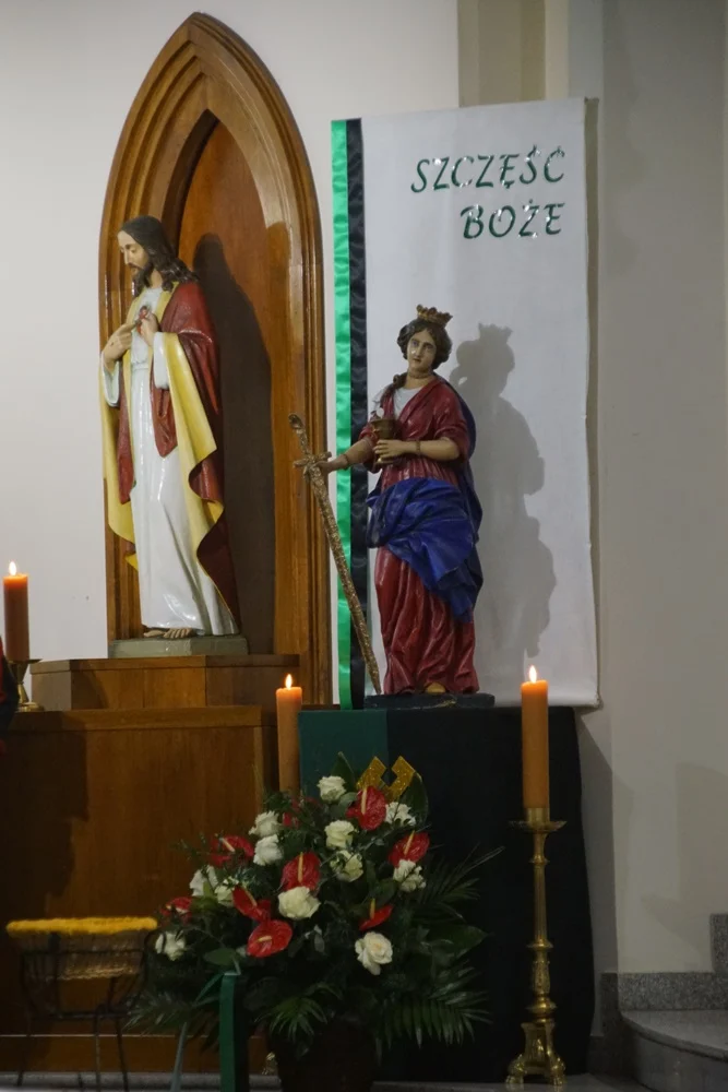 Ówczesny metropolita katowicki, arcybiskup Damian Zimoń, przekazał wtedy władzom miasta odpowiedni dekret Stolicy Apostolskiej. Jej wizerunek umieszczono również w miejskim herbie. Święta przedstawiona jest w błękitnej sukni, spowita czerwonym płaszczem, w prawej ręce trzyma złoto-srebrny miecz (symbol męczeńskiej śmierci), a w lewej złoty kielich z Hostią. Dodajmy, że w drugim polu tarczy znajduje się pół złotego orła na błękitnym polu. Był on herbem rodowym Piastów górnośląskich, a obecnie jest herbem województwa śląskiego.