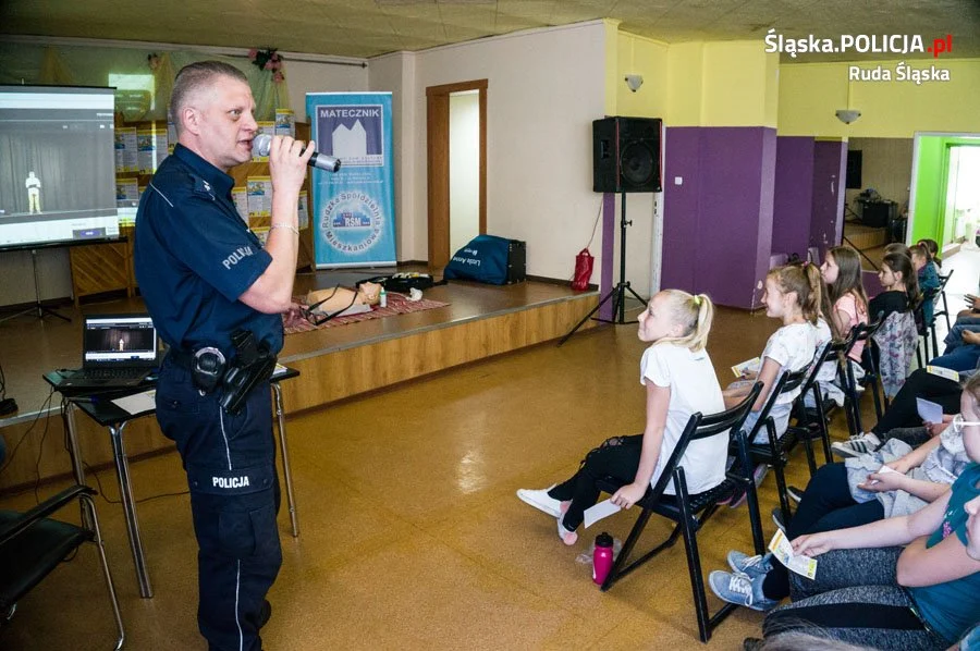 Rudzki dzielnicowy przedstawił dzieciom zasady jakie obowiązują podczas letniego wypoczynku, górskich wycieczek i kąpieli w zbiornikach wodnych. Zebrani uczniowie dowiedzieli się jakie są najważniejsze zasady bezpieczeństwa w trakcie przebywania na podwórku i jak mają się zachować gdy zostaną nagabywani przez obcych. Każdy z uczestników otrzymał ulotkę wydaną specjalnie na to spotkanie a zawierającą podstawowe zasady jakimi należy się kierować aby być bezpiecznym. Dużym zainteresowaniem cieszył się także pokaz podstawowych czynności ratunkowych zaprezentowany przez zawodowego ratownika medycznego. Liczymy, że dzięki tego typu spotkaniom z uczniami podstawówek, będą oni wiedzieć jak unikać zagrożeń podczas wakacyjnych wyjazdów.