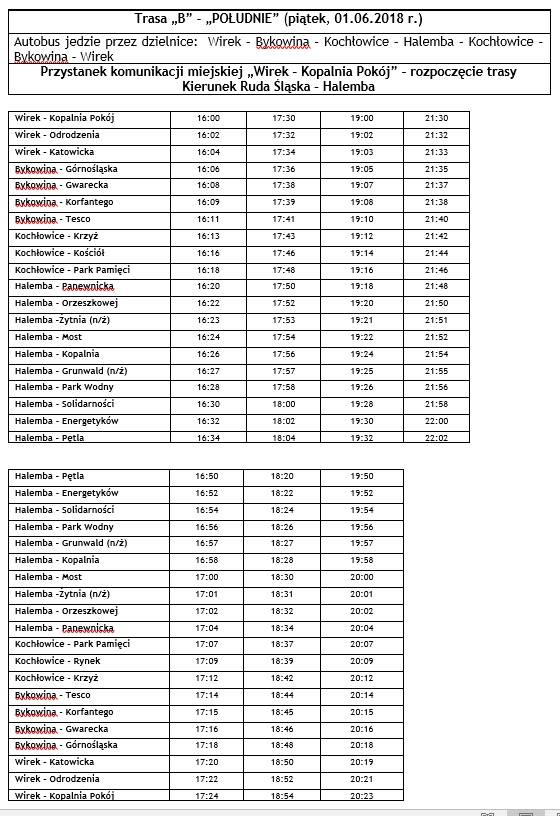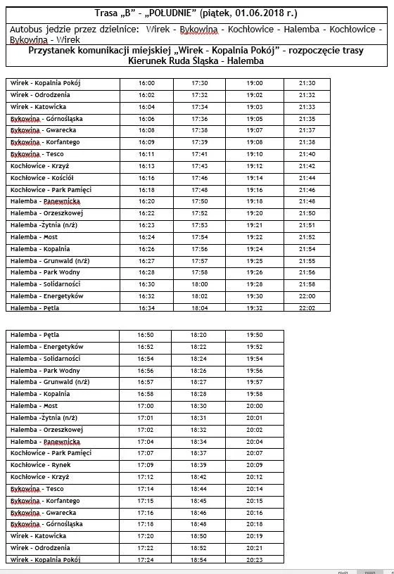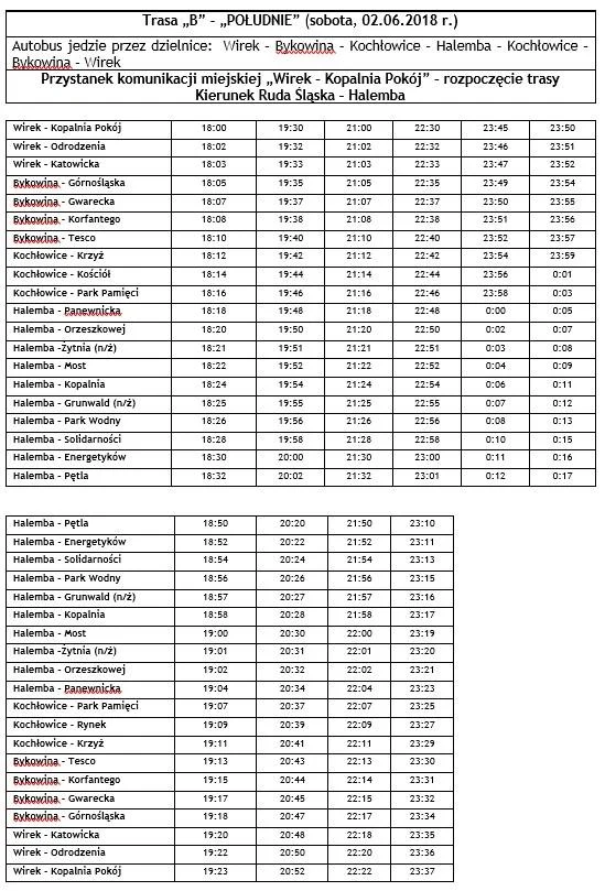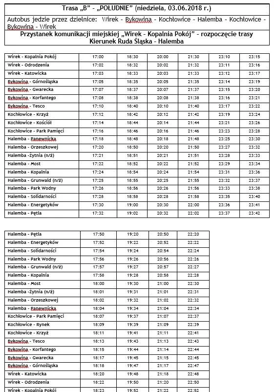 - Autobus „B” – kierunek Halemba (jedzie przez: Wirek – Bykowina – Kochłowice – Halemba i następnie z pętli autobusowej na Halembie wraca drogą powrotną tak jak przyjechał, czyli Halemba – Kochłowice – Bykowina – Wirek).