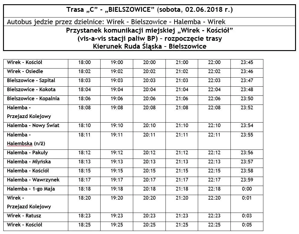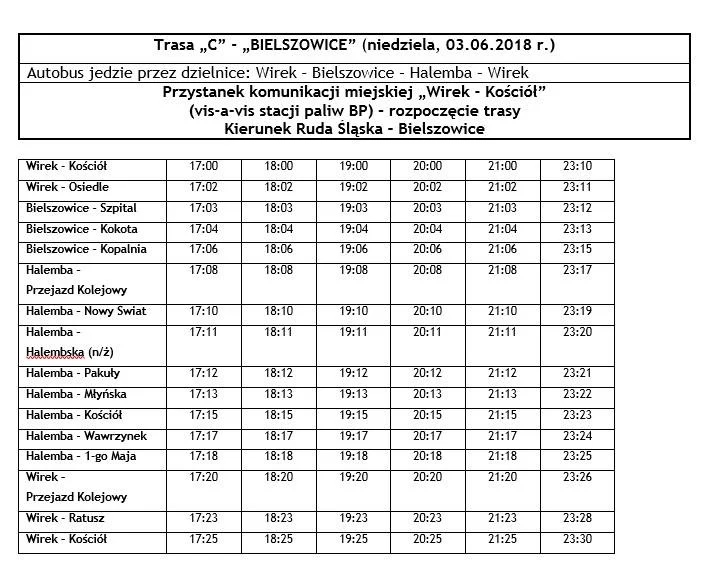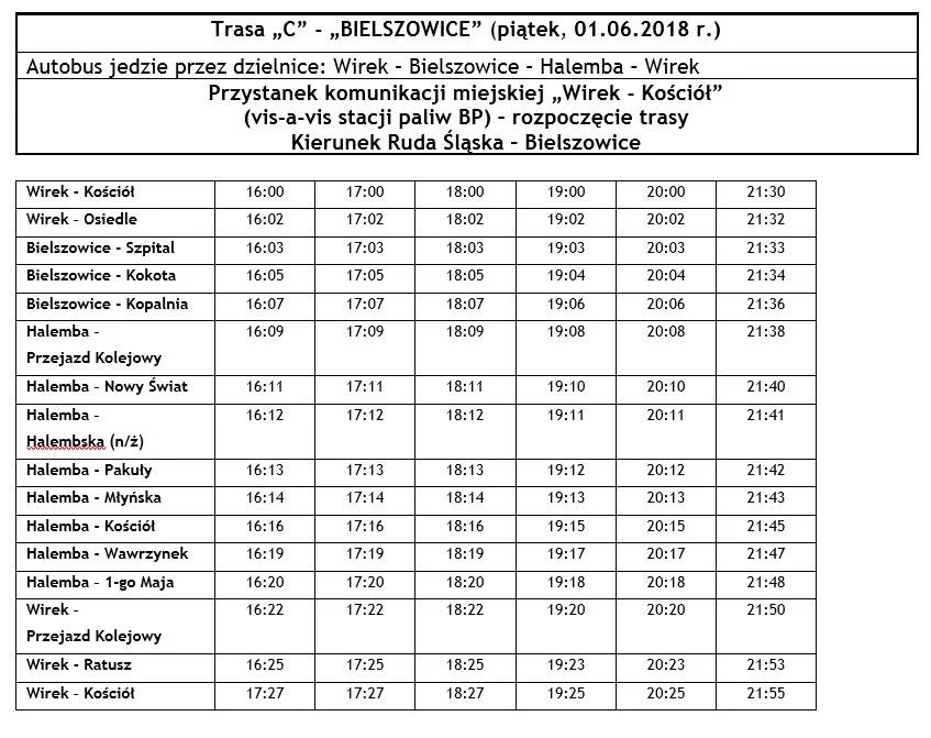 - Autobus „C” – kierunek Bielszowice (jedzie przez: Wirek – Bielszowice – Halemba – Wirek) Autobus linii C rozpoczyna swe kursy z przystanku o nazwie „Wirek Kościół” (vis-a-vis stacji paliw BP, która znajduje się na ul.1-go Maja).