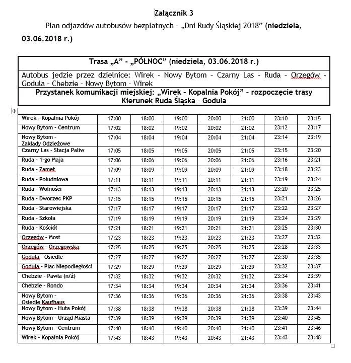 W najbliższy weekend /01-03 06/ po Rudzie Śląskiej kursowały będą trzy bezpłatne linie autobusowe „A”, „B” i „C”. Mieszkańcy będą mogli bezpośrednio dostać się na wireckie targowisko i bezpiecznie powrócić po zakończonych Dniach Rudy Śląskiej do domu. Linie autobusowe swoim zasięgiem obejmą wszystkie dzielnice.