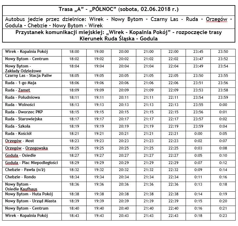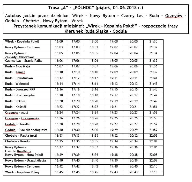 - Autobus „A” – kierunek Godula (jedzie przez: Wirek – Nowy Bytom – Czarny Las – Ruda – Orzegów – Godula – Chebzie – Nowy Bytom – Wirek).
