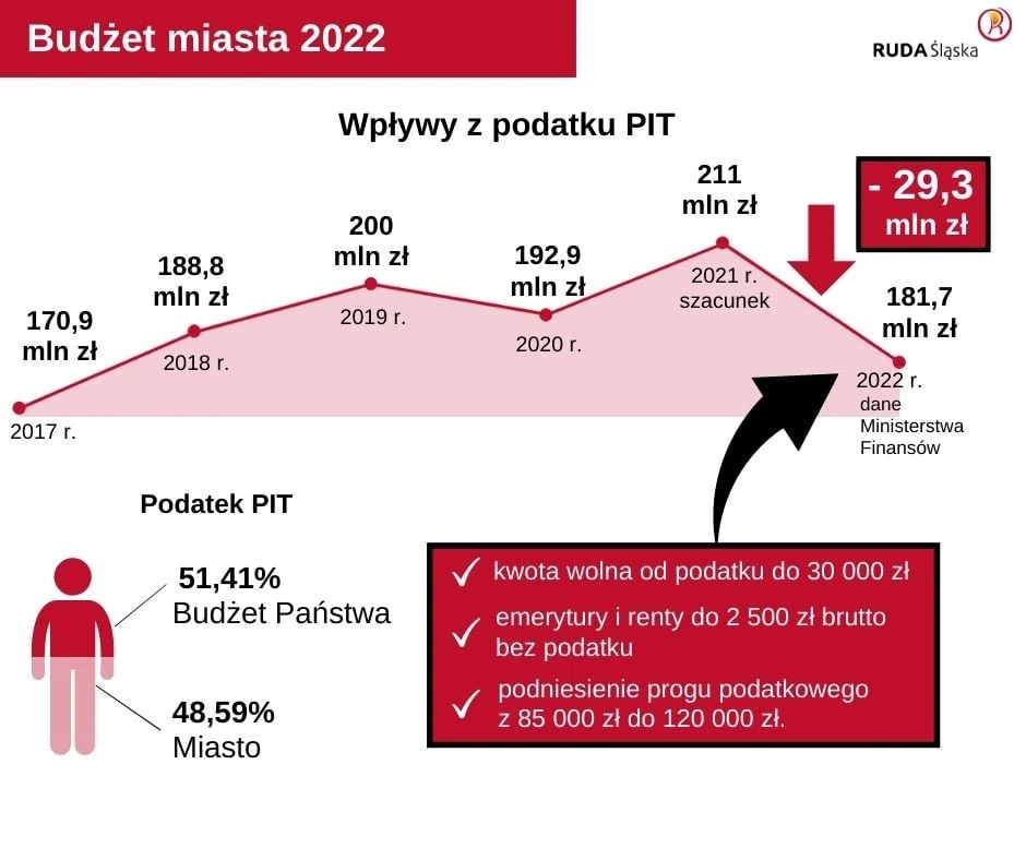 Ruda Śląska podobnie jak inne samorządy w przyszłym roku zmagać się będzie także z problemem mniejszych dochodów z udziału w podatku PIT. W porównaniu do szacowanego tegorocznego wykonania, ubytek ten wynieść może ponad 29 mln zł. To efekt zmian w prawie podatkowym wynikających z uchwalenia tzw. „Polskiego Ładu”. Rząd, aby zrekompensować tę stratę samorządom przekaże im jeszcze w tym roku dodatkowe środki w ramach uzupełnienia subwencji ogólnej. Dla Rudy Śląskiej będzie to kwota 33,3 mln zł.