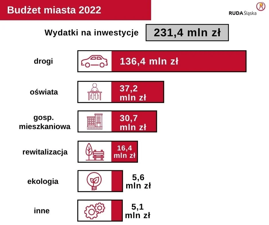 Z zaplanowanych 231,4 mln zł na inwestycje, najwięcej bo ponad 136 mln zł przypaść ma na drogi. Kontynuowana będzie budowa trasy N-S w kierunku autostrady, rozpocząć się ma przebudowa ul. Wolności w Rudzie oraz modernizacja ul. Bałtyckiej w Kochłowicach. Ponadto kontynuowana będzie modernizacja ul. Janasa. Ponad 37 mln zł mają wynieść wydatki na inwestycje oświatowe.