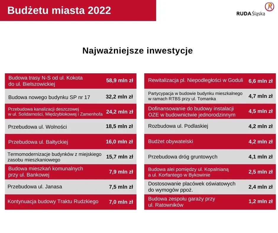 Blisko 1/4 tej kwoty, czyli ponad 231 mln zł przeznaczonych zostanie na inwestycje. Najwięcej, bo ponad 136 mln zł pochłoną zadania drogowe z kontynuacją budowytrasy N-S, przebudową ul. Wolności oraz modernizacją ul. Bałtyckiej. W przyszłym roku ruszyć ma budowa nowych mieszkań komunalnych w Rudzie, kontynuowana będzie budowa nowego budynku szkoły w Bielszowicach. Te oraz kilkadziesiąt innych zadań inwestycyjnych znalazło się w uchwalonym dziś przez Radę Miasta budżecie Rudy Śląskiej na 2022 r.