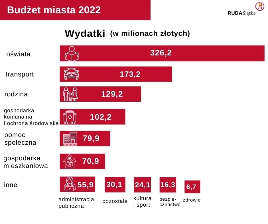 Tu sztandarową pozycją jest budowa nowego budynku Szkoły Podstawowej nr 17 w Bielszowicach. Ponad 30 mln zł przeznczonych ma być na gospodarkę mieszkaniową. Środki mają być przeznaczone na budowę nowych mieszkań komunalnych przy ul. Bankowej w Rudzie, partycypację w budowie nowego budynku mieszkalnego w ramach RTBS przy ul. Tomanka w Orzegowie, czy termomodernizację kilkunastu budynków wielorodzinnych znajdujących się w miejskim zasobie mieszkaniowym. Na zadania rewitalizacyjne w przyszłym roku przeznaczonych ma zostać 16,4 mln zł. M.in. kontynuowana ma być rewitalizacja dwóch parków w Nowym Bytomiu w ramach budowy Traktu Rudzkiego. Nową inwestycją ma być natomiast rewitalizacja pl. Niepodległości w Goduli oraz budowa alei pomiędzy ul. Kopalnianą a ul. Korfantego w Bykowinie. Ponad 5,5 mln zł ma wynieść pula środków na realizację przedsięwzięć z zakresu ekologii. Realizowany będzie kolejny etap dofinansowania do budowy instalacji OZE w budownictwie jednorodzinnym. Zaplanowano także wydatki na dopłatę do wymiany systemów ogrzewania na ekologiczne.