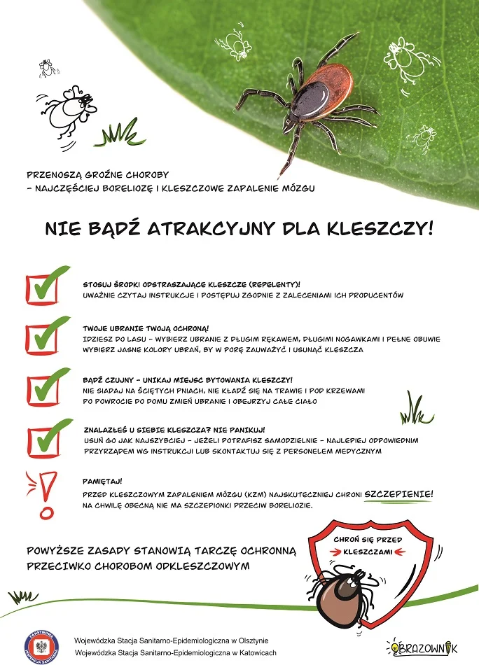 Choroby odkleszczowe to grupa chorób zakaźnych przenoszonych przez zainfekowane kleszcze. Do zakażenia dochodzi zwykle na skutek ukłucia, w czasie którego do krwiobiegu wraz ze śliną lub wymiotami kleszcza dostają się groźne patogeny. Najczęściej występującą chorobą odkleszczową jest borelioza z Lyme, która jest przewlekłą wielofazową chorobą układową charakteryzującą się występowaniem objawów skórnych, stawowych, kardiologicznych i neurologicznych. Różnorodność objawów oraz podobieństwo do wielu innych schorzeń znacznie utrudnia rozpoznanie. Aby zmniejszyć ryzyko zachorowań na choroby odkleszczowe, organizatorzy Śląskiego Państwowego Wojewódzkiego Inspektora Sanitarnego oraz Warmińsko-Mazurskiego Państwowego Wojewódzkiego Inspektora Sanitarnego postanowili przeprowadzić kampanię edukacyjną. Jej celem jest propagowanie podstawowych zasad ochrony przed kleszczami oraz zwiększenie świadomości społecznej na temat chorób odkleszczowych.