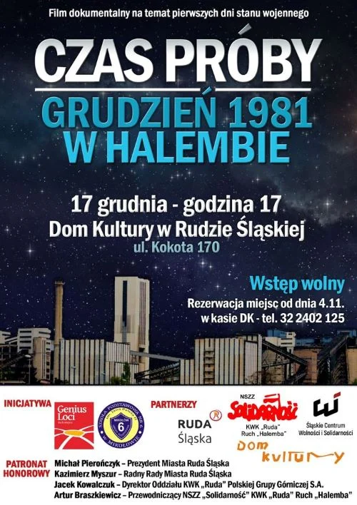 17 grudnia w Domu Kultury w Rudzie Śląskiej odbędzie się uroczysta premiera filmu dokumentalnego ”Czas próby. Grudzień 1981 roku w Halembie”. Film skupia się na ukazaniu pierwszych dni stanu wojennego w tej dzielnicy.