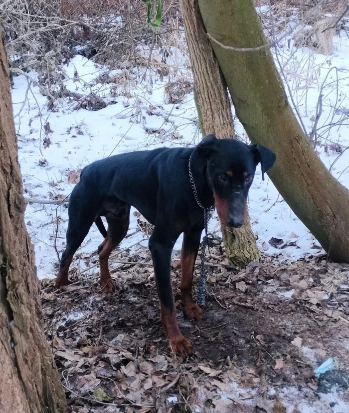 Wspomniany doberman został porzucony w lasku przy schronisku w piątek, 23 stycznia, późnym wieczorem. Pies był przypięty grubym łańcuchem i spędził w mrozie całą noc. Warto podkreślić, że porzucono go poza zasięgiem kamer.