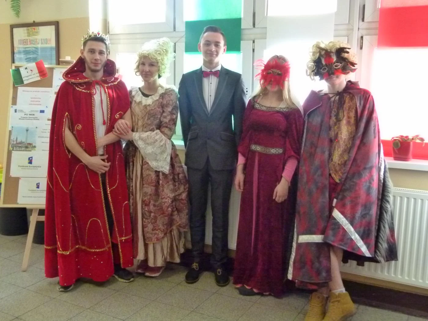 Na zakończenie poczęstowaliśmy wszystkich pizzą i pysznymi zapiekankami,które przygotowała szkolna kuchnia, więcbyły i włoskie smaki. Korytarzami szkolnymi przechadzali się uczniowie w strojach rodem z Wenecji, a także w strojach, przebraniach i maskach według własnych pomysłów.