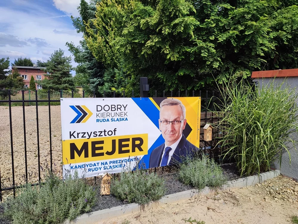 Na płotach można też zobaczyć banery popierające kandydaturę Krzysztofa Mejera.