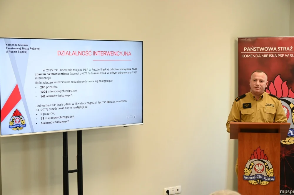 Komenda Miejska Państwowej Straży Pożarnej w Rudzie Śląskiej podczas dzisiejszej odprawy rocznej podsumowała swoją działalność w 2025 r. Strażacy interweniowali na terenie miasta 1635 razy, co stanowi wzrost w stosunku do roku 2024, kiedy zdarzeń było 1561.