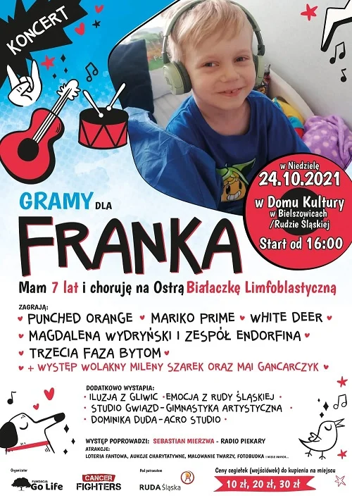 Już w najbliższą niedzielę (24 października) będzie można wesprzeć małego rudzianina, który cierpi na ostrą białaczkę limfoblastyczną typu B. W Domu Kultury w Bielszowicach o godz. 16:00 odbędzie się koncert charytatywny, podczas którego nie zabraknie wielu atrakcji, a przy okazji odbędzie się zbiórka funduszy potrzebnych na leczenie siedmioletniego Franka. Organizatorem wydarzenia jest Fundacja Go Life.