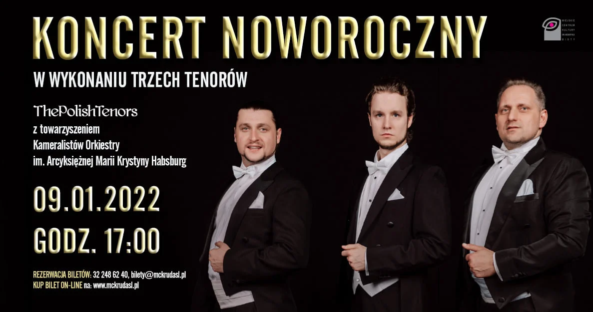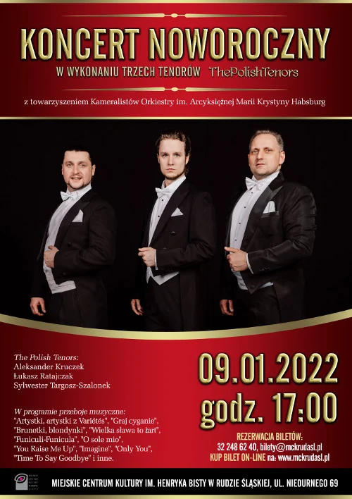 9 stycznia 2022 (niedziela) godz. 17.00 – Koncert Noworoczny Trzech Tenorów „The Polish Tenors” z towarzyszeniem Kameralistów Orkiestry im. Arcyksiężnej Marii Krystyny Habsburg.