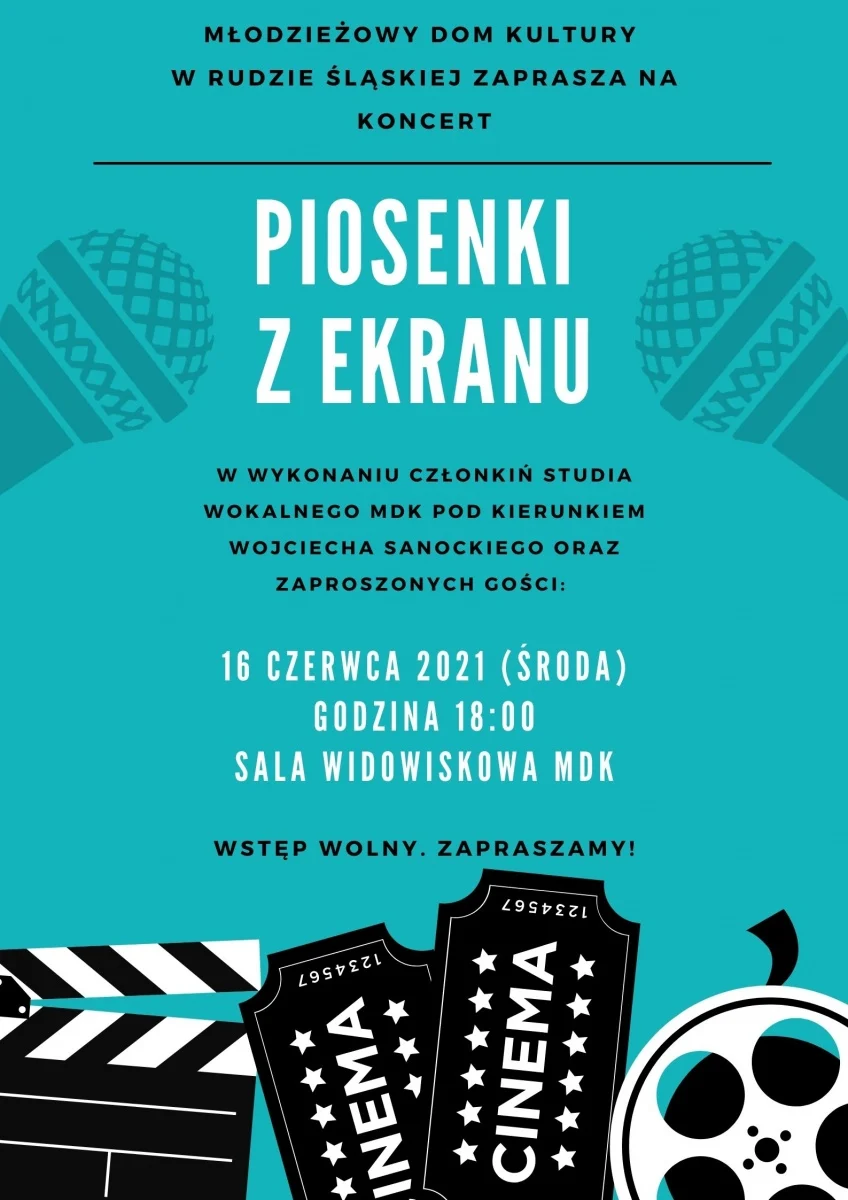 Serdecznie zapraszamy na koncert „Piosenki z ekranu” w wykonaniu członkiń Studia Wokalnego MDK pod kierunkiem Wojciecha Sanockiego oraz zaproszonych gości. Wstęp wolny.Tagi:koncert