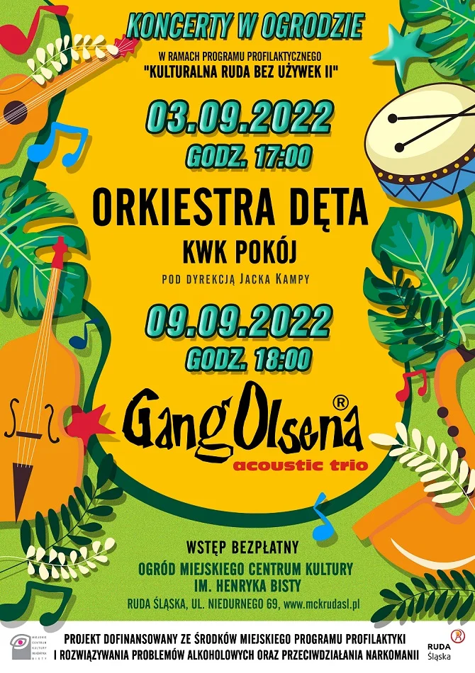 3 oraz 9 września br. w Ogrodzie MCK odbędą się koncerty plenerowe w ramach Programu Profilaktycznego „Kulturalna Ruda – bez używek II”. Projekt dofinansowany ze środków Miejskiego Programu Profilaktyki i Rozwiązywania Problemów Alkoholowych oraz Przeciwdziałania Narkomanii.