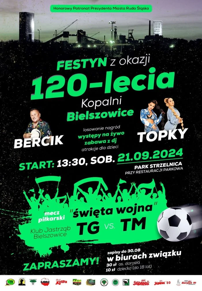 Przedstawiciele związków zawodowych działających w bielszowickiej kopalni zapraszają wszystkich bardzo serdecznie na wspólne świętowanie 120-lecia! Festyn rozpocznie się o 13:30 w Parku Strzelnica, tuż restauracji Parkowej. Na scenie wystąpią Bercik i zespół Topky, przewidziano również zabawę z DJ-em. Oprócz występów na żywo, organizatorzy zapowiadają także losowanie nagród i atrakcje dla dzieci. W ramach festynu odbędzie się również mecz piłkarski. Impreza została objęta patronatem prezydenta miasta Michała Pierończyka.