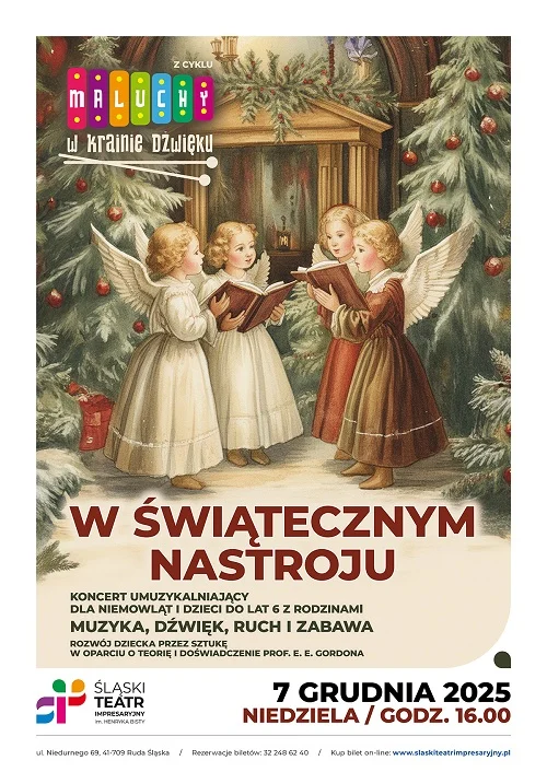Święta tuż za rogiem! Z tej okazji ŚTI zaprasza na wyjątkowy koncert umuzykalniający „W świątecznym nastroju” w ramach cyklu „Maluchy w krainie dźwięku”. To wydarzenie jest skierowane do niemowląt oraz dzieci do 6. roku życia wraz z rodzinami. Koncert odbędzie się 7 grudnia 2025 roku o godzinie 16:00 w Śląskim Teatrze Impresaryjnym w Rudzie Śląskiej. Bilety dostępne są w cenie 30 zł dla rodzica/opiekuna i 25 zł dla dziecka.