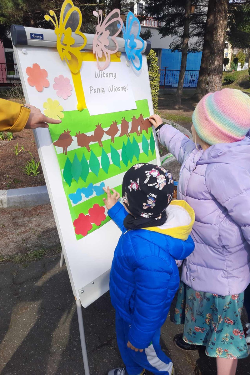 23 marca wychowankowie przedszkola powitali długo wyczekiwaną wiosnę.Dzieci przygotowywały się do Dnia Ziemi, uczestnicząc w zajęciach i pogadankach. Poznały charakterystyczne cechy wiosny, tradycyjne obrzędy pożegnania zimy i powitania nadchodzącej pory roku oraz przygotowały rekwizyty: marzannę i gaiki. W trakcie przemarszu wokółplacówki uczestnicy śpiewali piosenki i przywoływali wiosnę, machając pięknymi gaikami. Kolorowy pochód zakończył się symbolicznym zatopieniem kukły Marzanny.