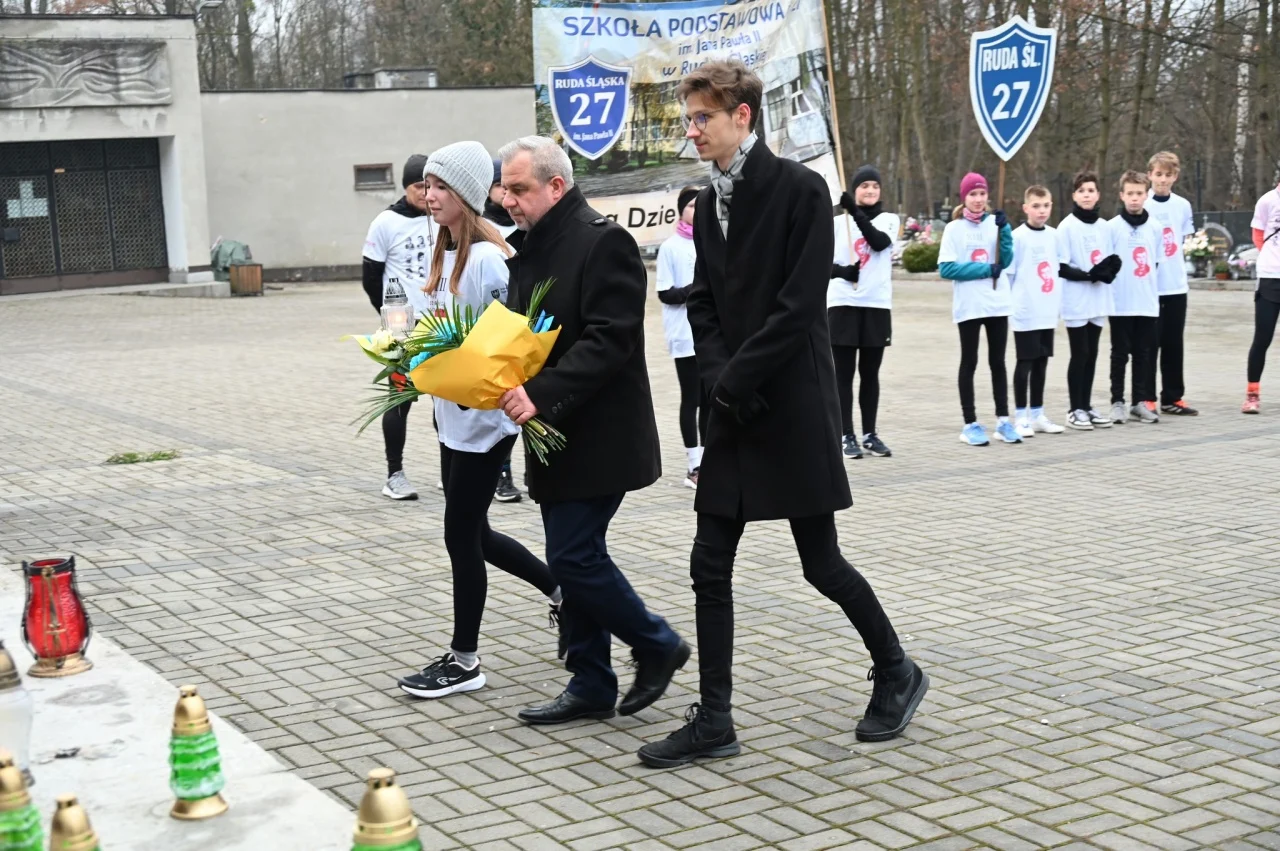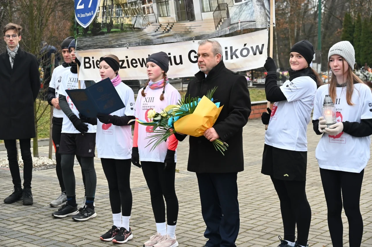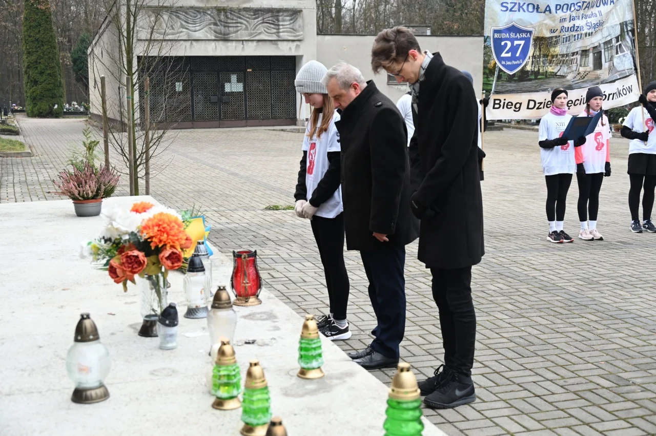 – Uczniowie wraz z dyrektorem szkoły praz opiekunami wyruszyli sprzed budynku szkoły już o godzinie 8.00. O 8.30 zatrzymali się na cmentarzu komunalnym w dzielnicy Halemba, aby oddać hołd Joachimowi Gnidzie – patronowi biegu i jednej z ofiar tragicznych wydarzeń z grudnia 1981 roku. Chwila zadumy nad jego mogiłą była symbolicznym przypomnieniem, że historia Śląska to także historia konkretnych ludzi i rodzin – informuje Gabriela Depta, nauczycielka ze Szkoły Podstawowej nr 27 w Rudzie Śląskiej – Halembie.