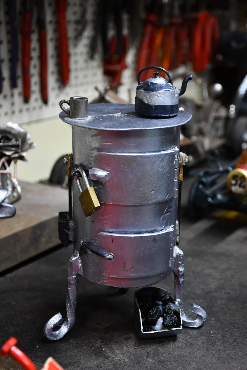 Dariusz Paszek: Z zawodu jestem blacharzem samochodowym, a co za tym idzie, od lat młodości miałem kontaktz blachą, wiem, jak obsługiwać palnik i spawać metal. Jednak moja pasja do tworzenia dzieł sztuki z blachy wykiełkowała we mnie stosunkowo niedawno. Kilka lat temu na prośbę mojego przyjaciela stworzyłem piec, który zamontował w swoim ogródku. Okazało się, że moje dzieło na tyle spodobało się innym, że zaczęli pytać, czy nie zrobię im podobnego. Jeden z kolegów zażyczył sobie podobny piec — poprosił jednak, by był on mniejszy. Nie musiał dwa razy prosić. Stworzyłem wówczas w ramach żartu miniaturową wersję piecyka. Co ważniejsze piec, mimo tego, że małych rozmiarów, jest w pełni sprawny. Udało mi się go nawet odpalić. Teraz służy mi, jako skarbonka.