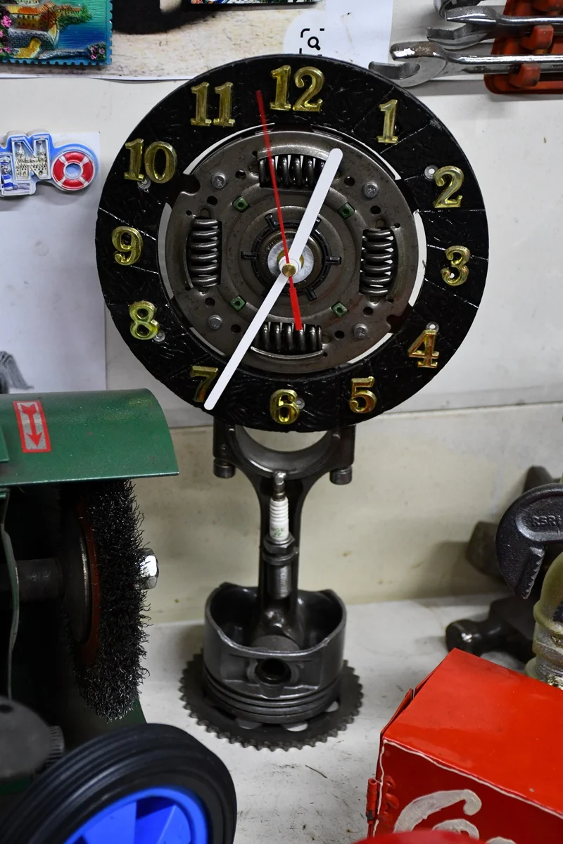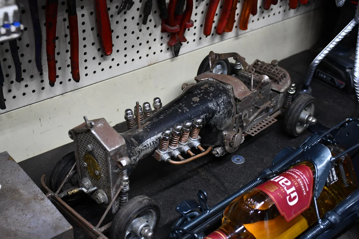 Dzieło, nad którym obecnie pracuję, powstaje natomiast z części starej maszyny do szycia. Postanowiłem zrobić z niej samochód. Praca nad tym projektem trwa już ponad miesiąc, ale jeszcze trochę pracy przede mną. W mojej pracowni nic się nie marnuje.