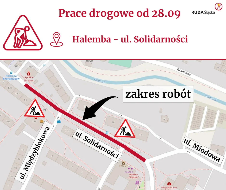 Uwaga kierowcy! Od środy 28 września przy ul. Solidarności w Halembie rozpoczną się prace związane z odtworzeniem jezdni w ramach prowadzonej tam przebudowy kanalizacji.