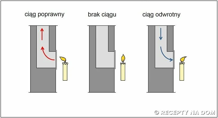 Do kratki wentylacyjnej zbliżamy płomyk świecy (zapalniczki czy zapałki). Obserwujemy kierunek wychylenia się płomienia. Gdy płomień skieruje się w stronę przewodu wentylacyjnego, dowiemy się, że ciąg jest właściwy. Gdy płomyk nie zareaguje lub wychyli się w stronę przeciwną – mamy problem.