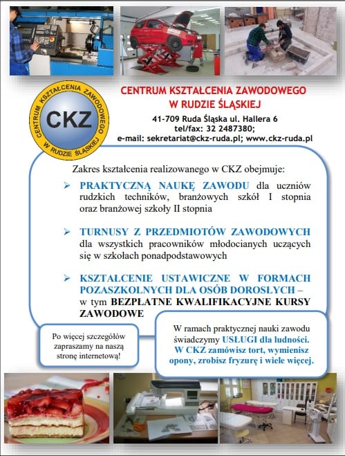 Przeważająca część uczniów szkół zawodowych odbywa praktyczną naukę zawodu w Centrum Kształcenia Zawodowego w Rudzie Śląskiej. Zajęcia odbywają się w czterech doskonale wyposażonych warsztatach przy udziale wysoce wykwalifikowanej kadry. Uczniowie kształcą się na poziomie branżowej szkoły I stopnia oraz technikum w wielu zawodach. Praktyczna nauka zawodu jest realizowana również u pracodawców. Uczeń ma wówczas status młodocianego pracownika.