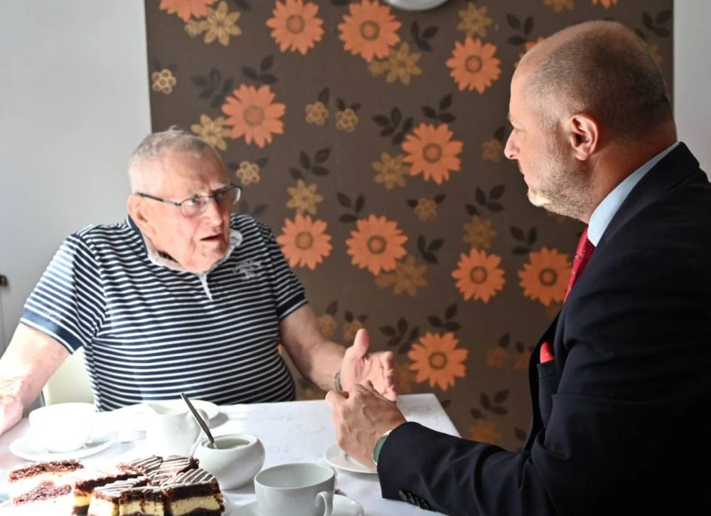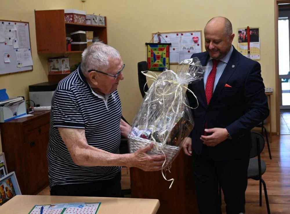 Pan Bernard dołączył do zaszczytnego grona 100-latków! W środę, 27 sierpnia, w Dziennym Domu „Senior-WIGOR” odbyło się wyjątkowe spotkanie z jubilatem, na którym pojawił się prezydent Michał Pierończyk. Podczas przyjęcia złożył panu Bernardowi życzenia i przekazał prezent. Miał również okazję nieco z nim porozmawiać.