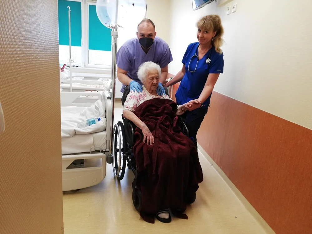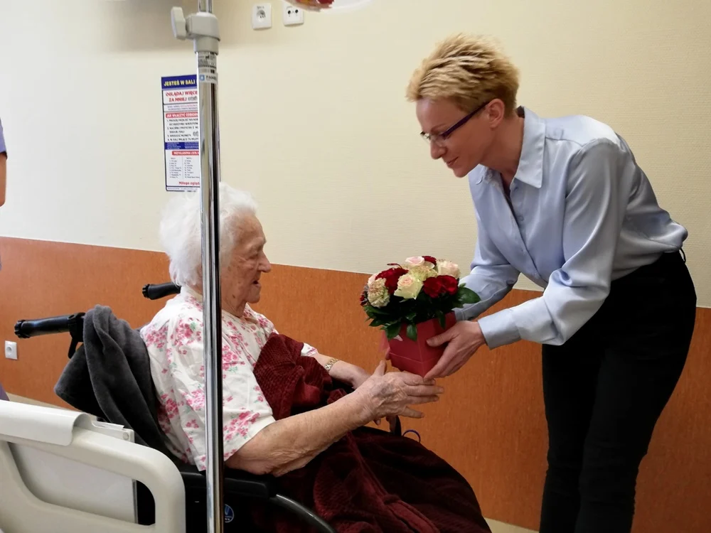 Pani Krystyna niestety nie świętowała swoich wyjątkowych, 100. urodzin w domu, ale w rudzkim szpitalu. Wyjątkową pacjentkę odwiedzili dzisiaj przedstawiciele zarządu szpitala oraz prezydent miasta Ruda Śląska, Michał Pierończyk, który złożył jubilatce życzenia i podarował prezent.