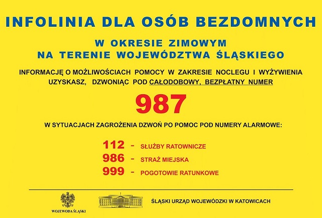 Od 1 listopada br., wzorem lat ubiegłych, Śląski Urząd Wojewódzki w Katowicach otwiera nową infolinię 987, mającą na celu wsparcie osób w kryzysie bezdomności podczas nadchodzącej zimy. Numer telefonu 987 jest bezpłatny i dostępny zarówno z telefonów komórkowych, jak i stacjonarnych.