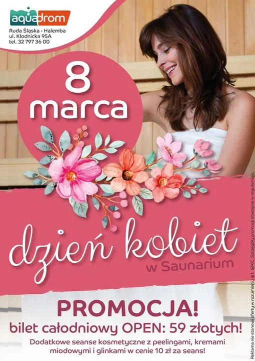 Z okazji Dnia Kobiet w środę 8 marca w Aquadromie każda z pań będzie mogła skorzystać z promocyjnej ceny biletu OPEN. Za bilet ten zapłacimy 59 zł i będzie on upoważniał do całodniowego korzystania z Saunarium oraz Strefy Rekreacji i Sportu. Dla osób lubiących relaks, w Saunarium będzie można skorzystać ze specjalne seansów kosmetycznych, takich jak: