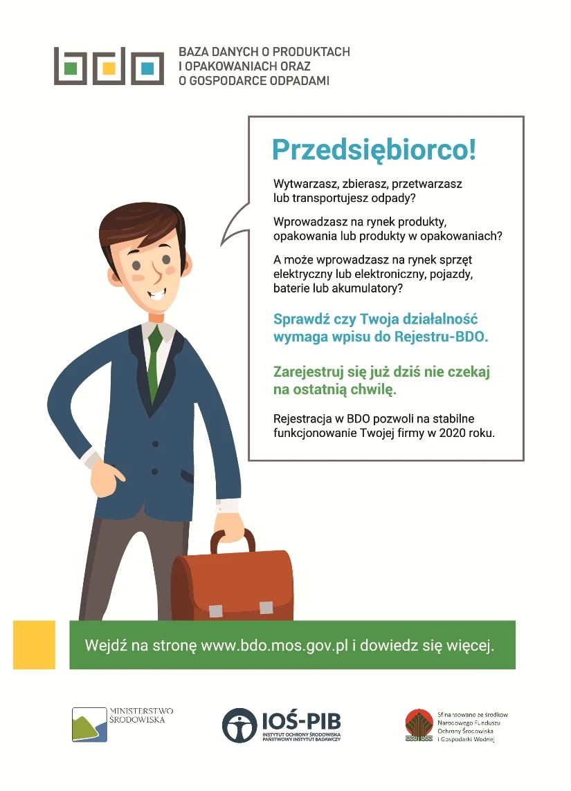 Baza danych o produktach i opakowaniach oraz o gospodarce odpadami czyli BDO jest narzędziem, które umożliwi skuteczną kontrolę rynku gospodarki odpadami, przyczyniając się tym samym do efektywniejszego wspierania organów inspekcji ochrony środowiska w walce z nieprawidłowościami występującymi w tym sektorze. Integralną częścią BDO jest Rejestr podmiotów wprowadzających produkty, produkty w opakowaniach i gospodarujących odpadami, który został uruchomiony 24 stycznia 2018 r. Od 1 stycznia 2020 r. uruchomione zostaną kolejne moduły systemu tj. moduł ewidencji i moduł sprawozdawczości realizowane przez Instytut Ochrony Środowiska-Państwowy Instytut Badawczy we współpracy z Ministerstwem Środowiska.