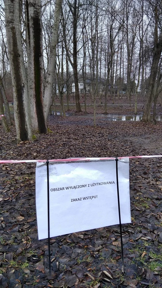 Rozlewisko w parku przy ul. Hallera. Część terenu została wyłączona z użytkowania