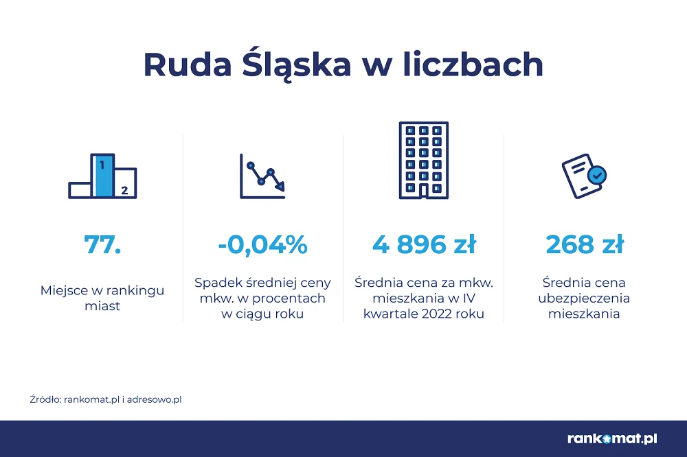 1 mkw. mieszkania w Rudzie Śląskiej oferowano w IV kw. 2021 r. za 4898 zł, a w IV kw. 2022 r. za 4896 zł. Ruda Śląska ma minimalnie wyższe stawki za 1 mkw. mieszkania z rynku wtórnego niż Rybnik (4885 zł). W regionie najdroższa jest Bielsko-Biała (7482 zł), która wyprzedziła Katowice (7033 zł). Ze wszystkich 78 sklasyfikowanych miast najbardziej kosztowna dla kupujących jest Warszawa, gdzie stawka za 1 mkw. kształtuje się na poziomie 13025 zł, z kolei najtańsze Jastrzębie-Zdrój (4143 zł) – wynika z zestawienia rankomat.pl.
