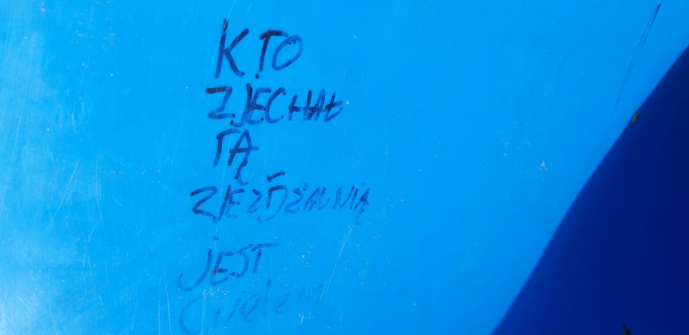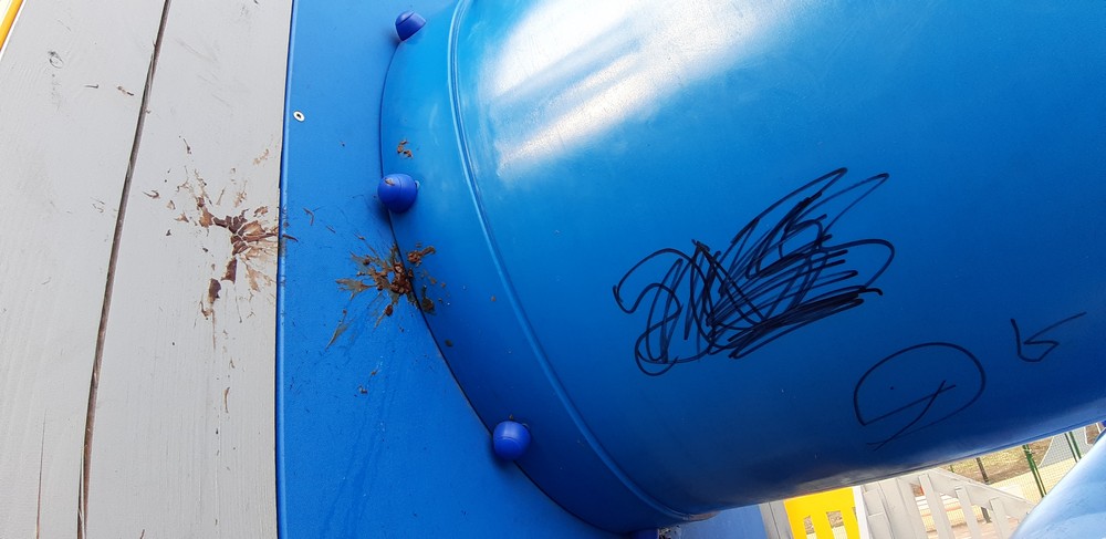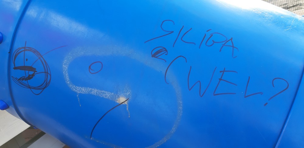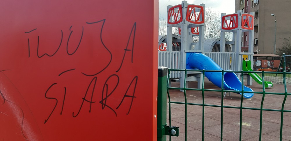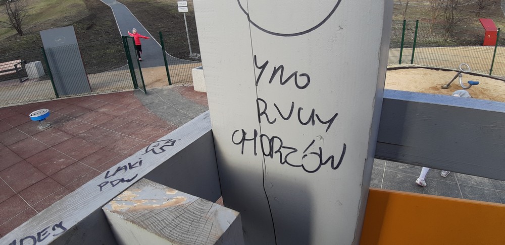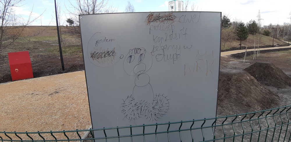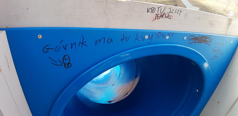 Wulgarne napisy i malunki, uszkodzenia na elementach drewnianych, zjeżdżalnia ochlapana farbą olejną, wyłamana furtka i urwane klamki, brak zamka, wyrwane stopnie oraz elementy ławek, wgniecenie przęseł ogrodzenia, napisy i wulgarne rysunki na tablicy zewnętrznej – tak wygląda nowy plac zabaw przy ulicy 1 Maja, który w grudniu został oddany do użytkowania. Wandalom wystarczyły trzy miesiące, a uszkodzeń nie brakuje również na ścieżce ekstremalnej biegnącej przez hałdę.