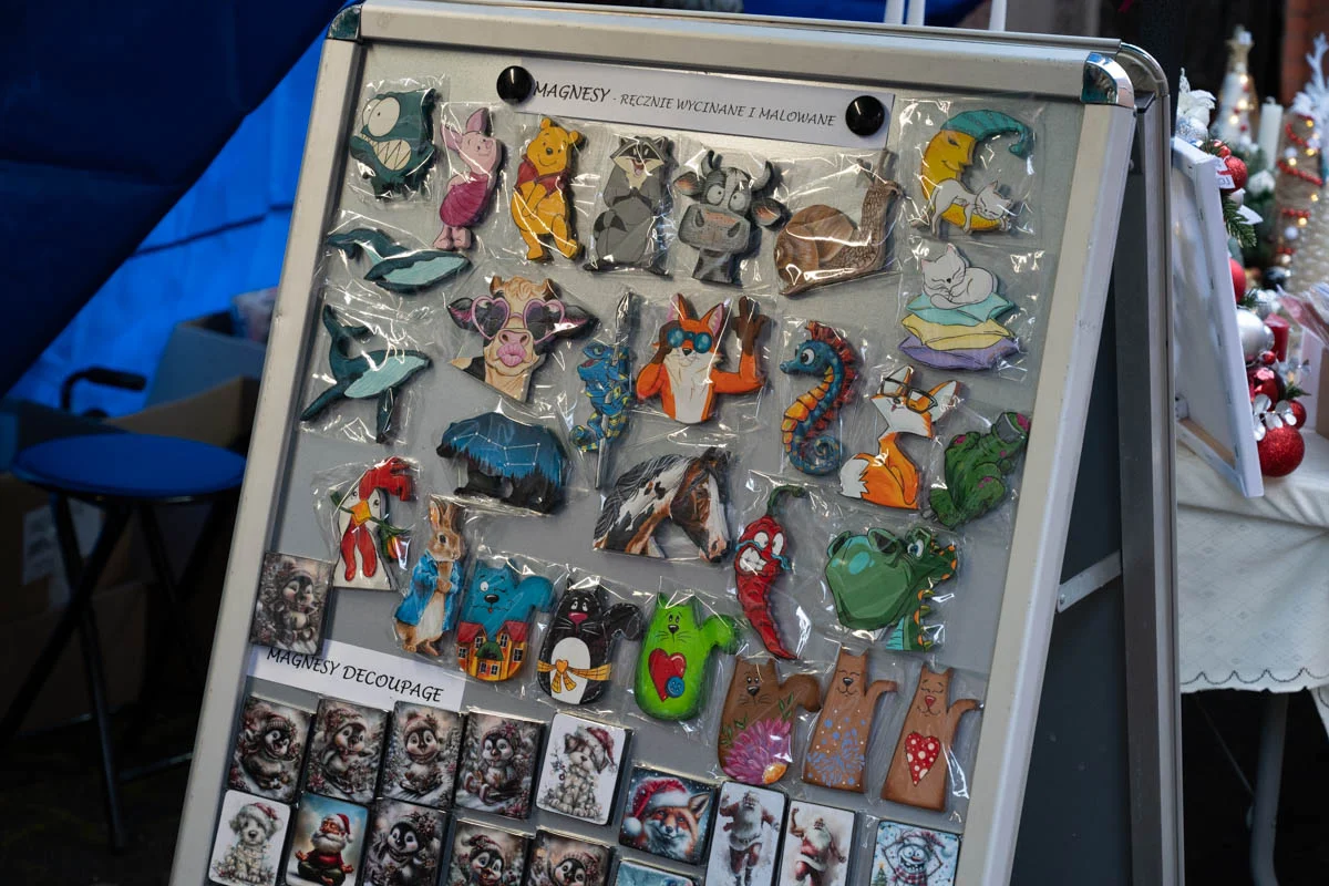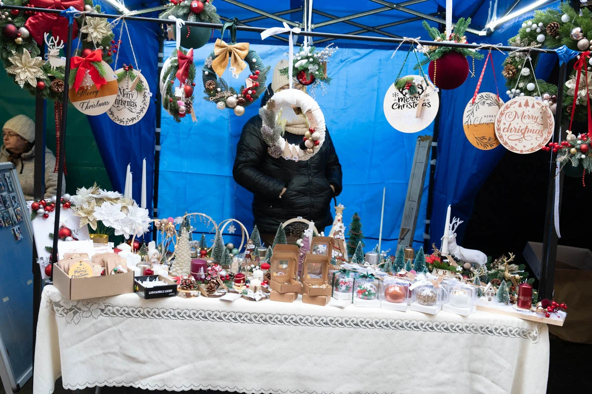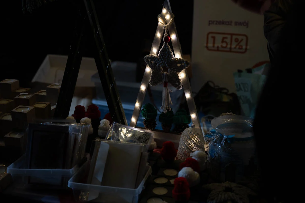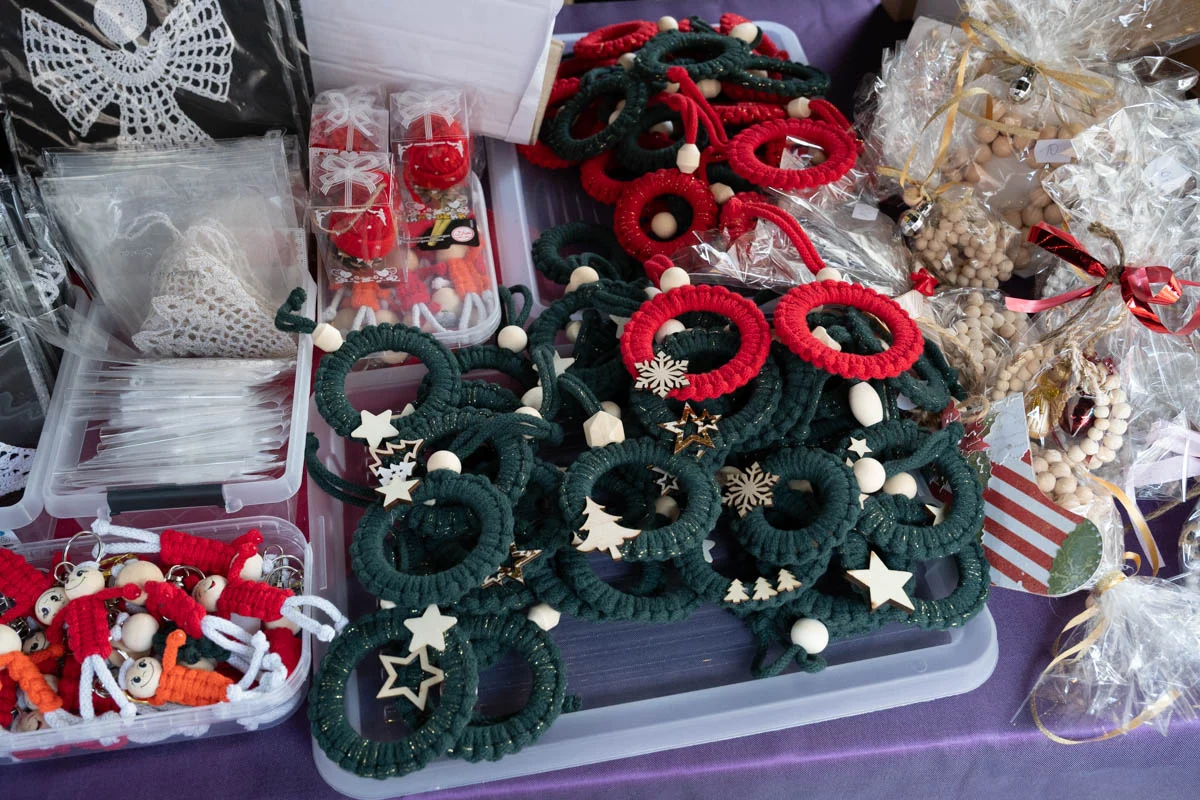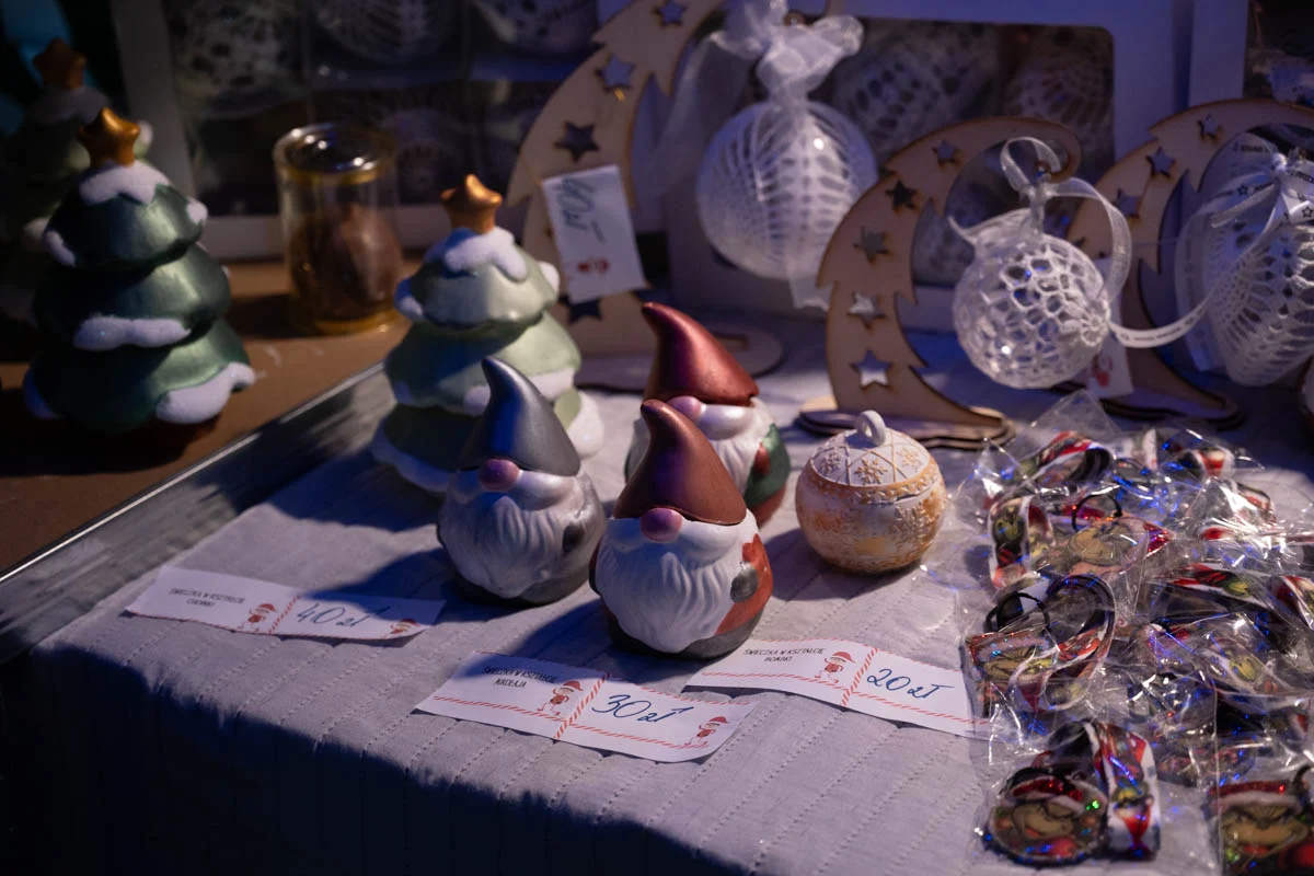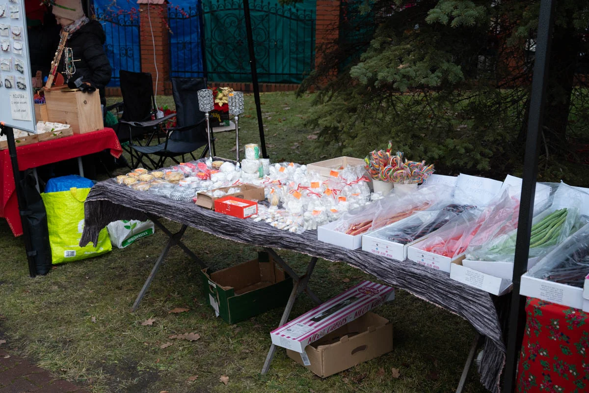 Na jarmarku nie zabrakło różnorodnych stoisk świątecznych. Mieszkańcy mogli kupić ręcznie robione ozdoby choinkowe, dekoracje do domu, czapki, szaliki i inne zimowe dodatki. Dużym zainteresowaniem cieszyła się biżuteria z żywicy, oryginalne zabawki dla dzieci oraz stoiska z domowymi wypiekami – ciastami, piernikami i ciasteczkami.