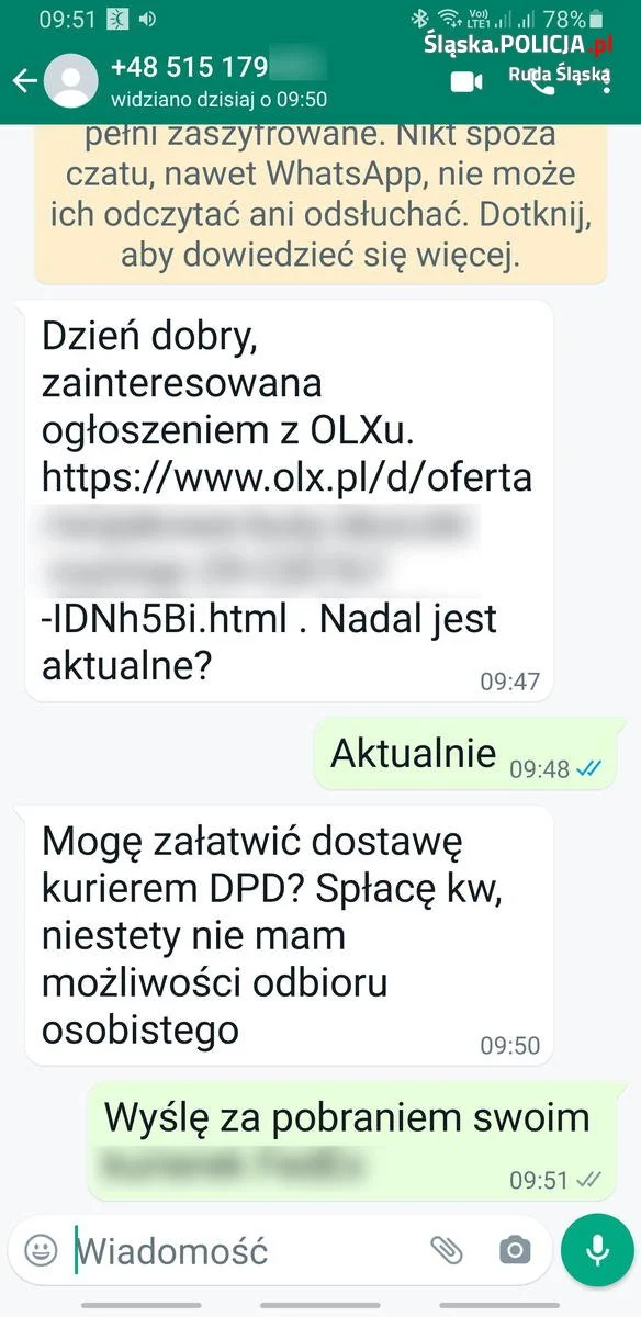 Z początkiem tego tygodnia na jeden z komisariatów w Rudzie Śląskiej zgłosiła się 71-latka, która chciała sprzedać na OLX kurtkę. Oczywiście dostała informację na Whatsapp z pytaniem o aktualność oferty, kliknęła w link i straciła poprzez Blik 3000 złotych.