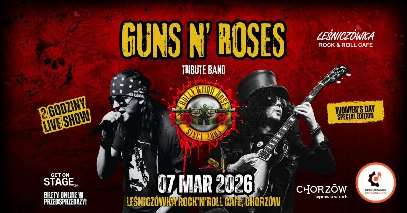 Przygotujcie się na potężną dawkę rock’n’rolla! Miłośników ciężkich brzmień, a przede wszystkim legendarnego Guns N’ Roses, organizatorzy zapraszają na wyjątkowy koncert w Leśniczówce.