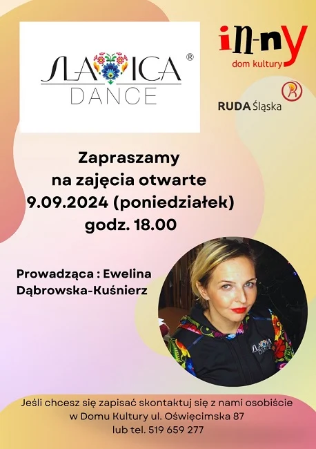 Zajęcia otwarte, odbędą się dnia 9.09.2024 (poniedziałek) o godz. 18.00 w In-nYm Domu Kultury ul. Oświęcimska 87. Obowiązuje wygodny strój oraz zmienne obuwie. Zajęcia poprowadzi Ewelina Dąbrowska-Kuśnierz pedagog, terapeuta zajęciowy, instruktor Slavica Dance Fitness.