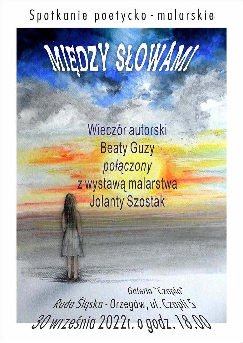 W piątek 30 września o godzinie 18:00 w Galerii Czapla (ul. Czapli 5) odbędzie się spotkanie autorskie z rudzianką Beatą Guzy. Spotkanie będzie dotyczyło debiutanckiego tomiku „Między słowami”, wydanego przez wydawnictwo Anagram. Jednocześnie odbędzie się również wystawa malarstwa Jolanty Szostak – autorki okładki i ilustracji do debiutanckiego tomiku. Uczestnicy spotkania będą mogli zobaczyć oryginały ilustracji.
