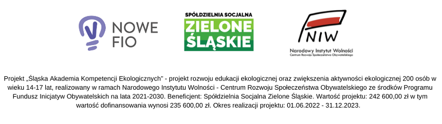 Projekt Śląska Akademia Kompetencji Ekologicznych realizowany jest w ramach Narodowego Instytutu Wolności – Centrum Rozwoju Społeczeństwa Obywatelskiego ze środków Programu Fundusz Inicjatyw Obywatelskich na lata 2021-2030.