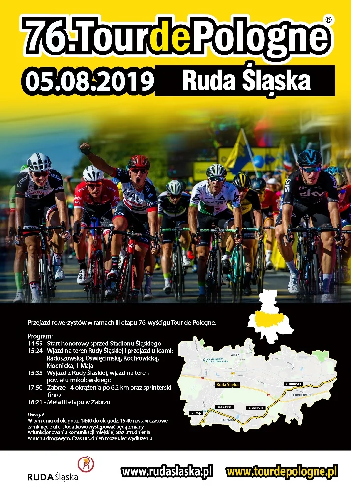 Z przejazdem kolarzy i całej kolumny wyścigu przez Rudę Śląską wiązać się będą utrudnienia drogowe. Pomiędzy godz. 14:40 a 15:40 nastąpi zamknięcie dróg, po których będą przemieszczać się kolarze /ul. Radoszowska, Oświęcimska, Kochłowicka, Kłodnicka i część 1 Maja – od ronda przy kościele w kierunku Mikołowa/.W związku z tym nastąpią utrudnienia w ruchu samochodowym oraz w funkcjonowaniu komunikacji publicznej. UWAGA! Podane godziny są orientacyjne. Rzeczywisty czas zamknięcia ulic utrudnień może ulec wydłużeniu.