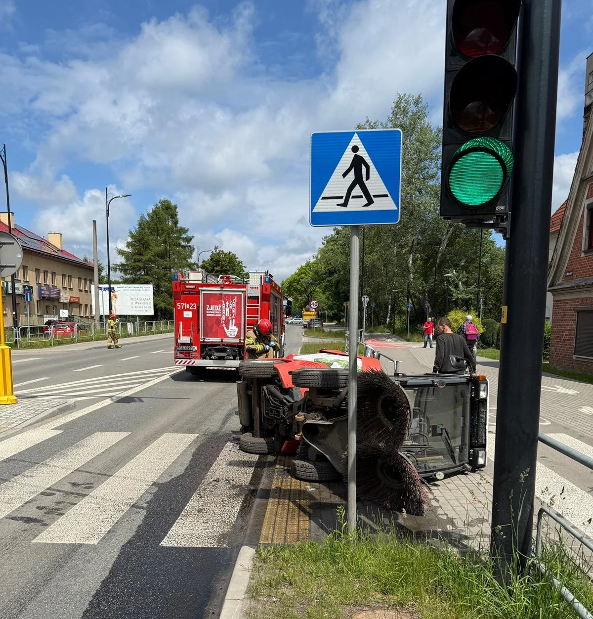 Dziś o godzinie 11:55 Komenda Miejska Państwowej Straży Pożarnej w Rudzie Śląskiej otrzymała zgłoszenie o przewróceniu się zamiatarki transportowanej na lawecie na ulicy Wolności, w pobliżu numeru 102.