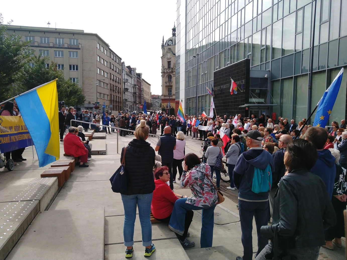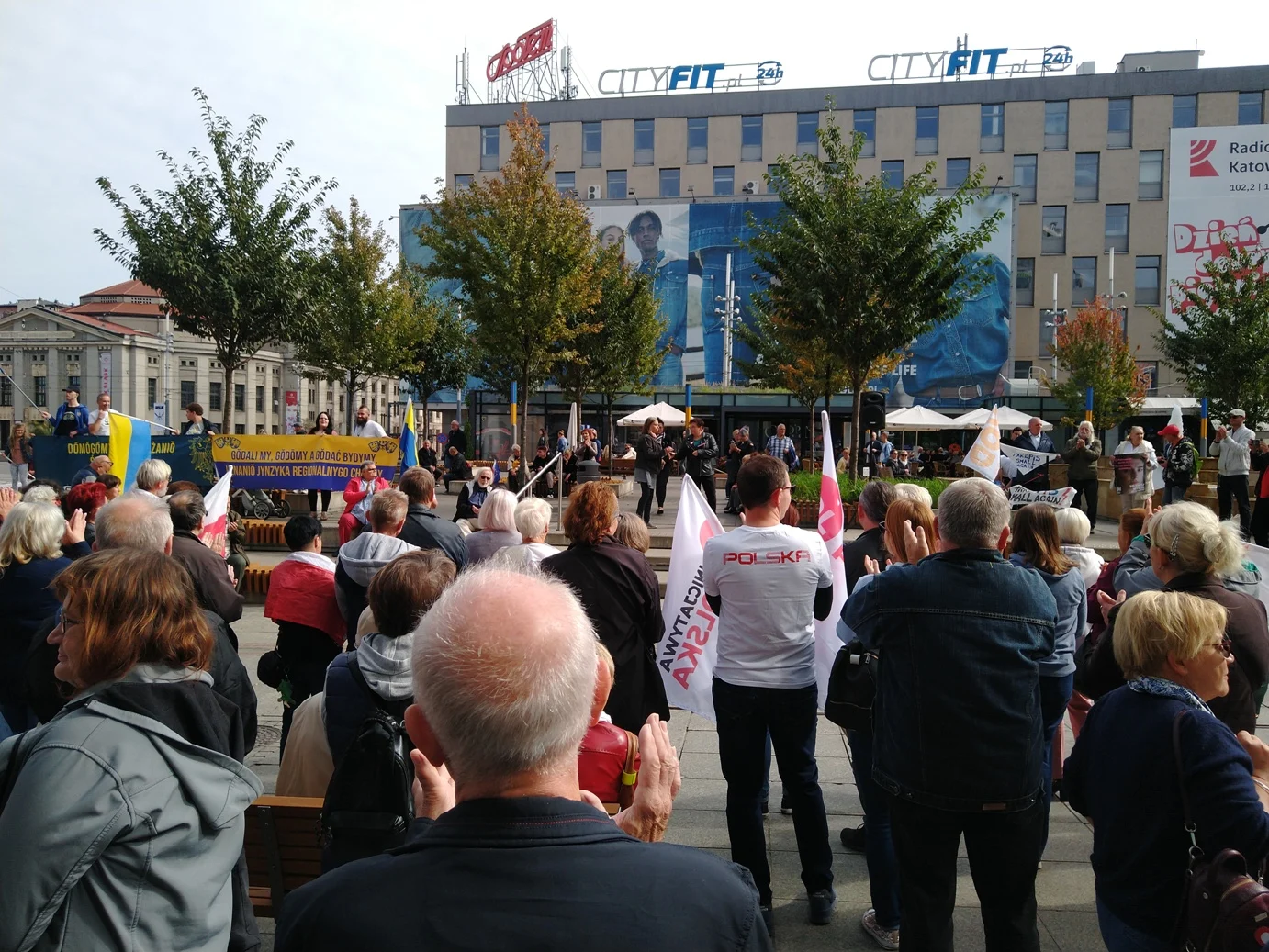 Na miejsce dotarliśmy mniej więcej kwadrans po godzinie 12, kilkanaście minut po oficjalnym otwarciu zgromadzenia. Na placu kwiatowym było już wówczas około 300, może 400 osób. Pojawili się działacze społeczni, nauczyciele, śląscy aktywiści (m.in. Pyjter Langer ze Ślonskiej Ferajny), a przede wszystkim, mieszkańcy Katowic.