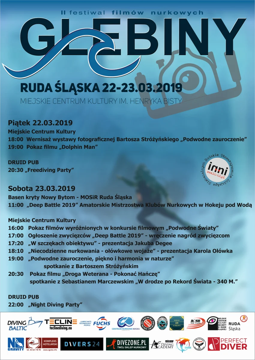 Z kolei w sobotnie przedpołudnie, o godz. 11.00, na basenie krytym w Nowym Bytomiu miłośnicy podwodnych wrażeń będę mieli okazję wystartować w Amatorskich Mistrzostwach Klubów Nurkowych w Hokeju pod Wodą „Deep Battle 2019”. Imprezę zakończy „Night Diving Party” w Druid Pub. Warto także wybrać się na piątkowe „Freediving Party”, które podsumuje pierwszy dzień festiwalu. Wstęp na wszystkie wydarzenia w ramach tegorocznej edycji „Głębin” jest bezpłatny. Organizatorem imprezy jest Rudzkie Stowarzyszenie Inicjatyw Niebanalnych In-nI.