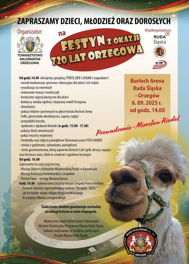 Festyn urodzinowy z okazji 720-lecia Orzegowa, organizowany przez Towarzystwo Miłośników Orzegowa, rozpocznie się o 14:00. Atrakcji nie zabraknie – zaplanowano stworzenie strefy gier i zabaw z nagrodami, przejażdżki bryczką, fotobudkę, pokazy służb mundurowych i klubów sportowych oraz malowanie twarzy. Na terenie Burloch Areny wydzielona zostanie również strefa gastronomiczna, którą zapewni Burloch Cafe. W ramach festynu będzie można także posłuchać występu Orkiestry Komendy Wojewódzkiej Policji w Katowicach, Katarzyny Danielewskiej z zespołem, Mariana Brzozy na Fletni Pana oraz Piotra Herdziny.