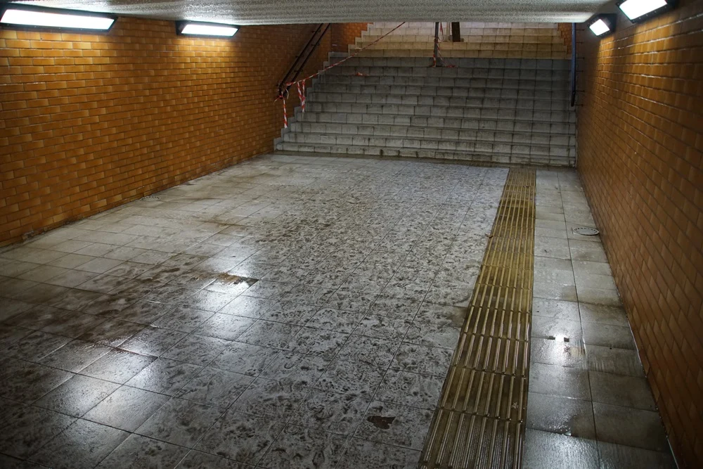 Obecnie z przejścia została usunięta zalegająca woda i swobodnie można przedostać się na peron.